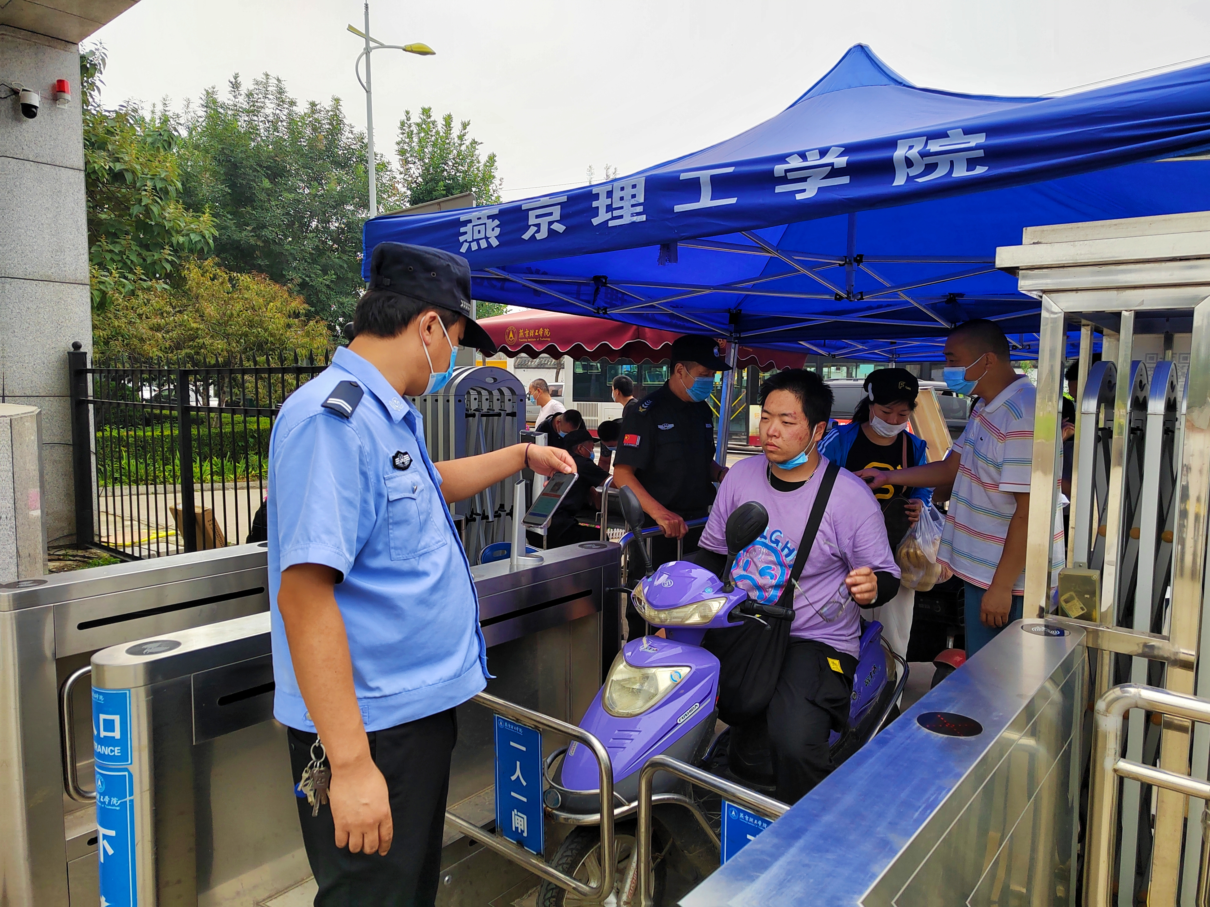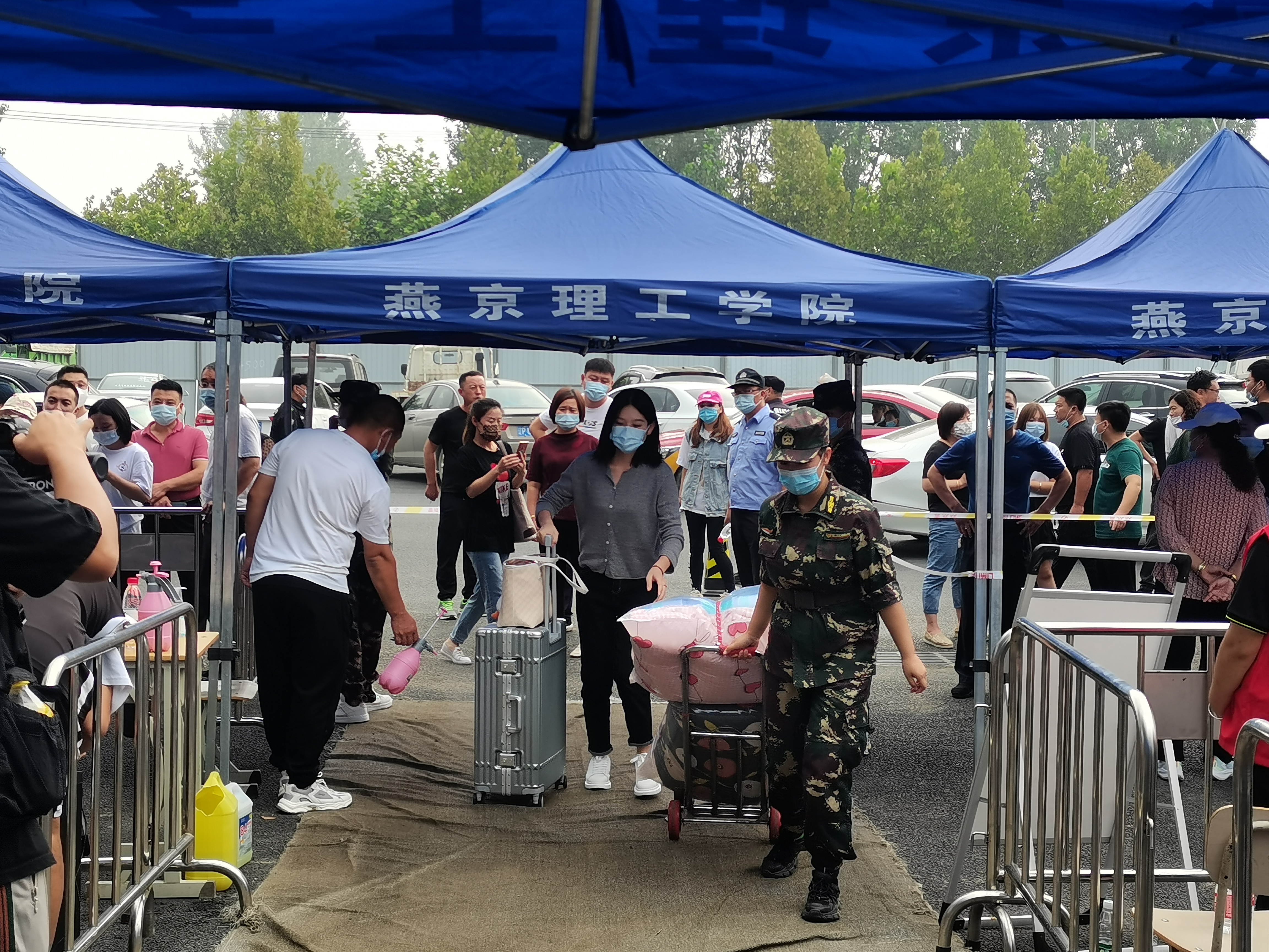 9月11日,燕京理工学院2021级新生们分批错峰报道(今日为专科生报道),校园内迎新横幅绚丽明目,行李搬运入口、学生入校通道、学生进校流程、身份核验、体温检测等指示标识一目了然,燕理校园四处洋溢着欢乐热情的氛围。