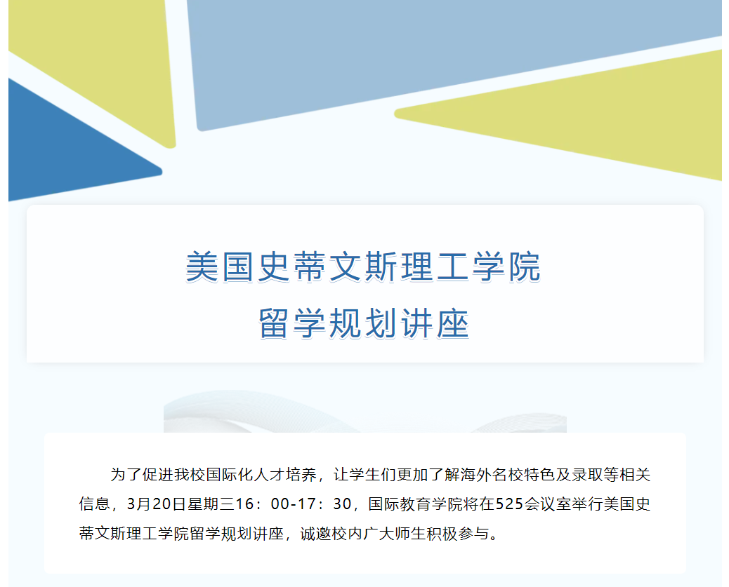 为了促进我校国际化人才培养,让学生们更加了解海外名校特色及录取等相关信息,3月20日星期三16:00-17:30,国际教育学院将在525会议室举行美国史蒂文斯理工学院留学规划讲座,诚邀智能工程学院与其余学院师生积极参与。 0…