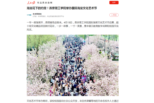 一年一度海棠开,燕理春色迎客来。4月13日,燕京理工学院国际海棠文化艺术节启幕,数十组文化精品项目映衬花间,一步一故事,一寸一美景,集中展示教育教学成果和校园文化风采。 文化艺术节举办期间,该校校园面向社会公众开放,来自京津冀等地的万余名校外人士通过预约入校,与全校师生共赏春日锦…
