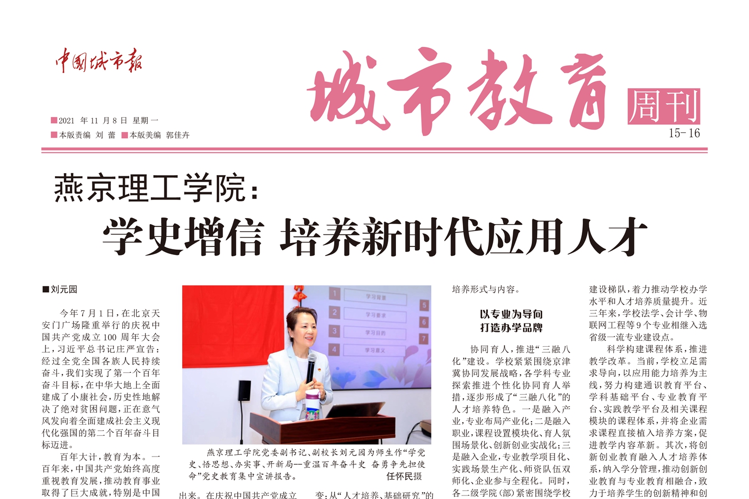 中国城市报2021年11月8日15版“城市教育周刊”:燕京理工学院:学史增信 培养新时代应用人才 《中国城市报》经国家新闻出版广电总局批准,由人民日报社主管,服务国家城镇化战略和推进中国城镇化进程的专业媒体。 报道原文: 今年7月1日,在北京天安门广场隆重举行的庆祝中国…