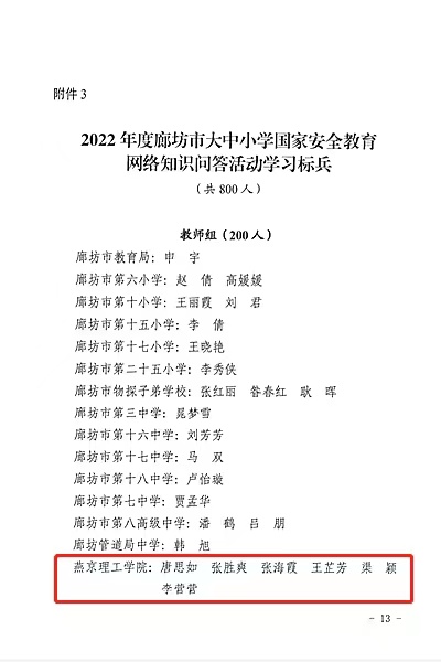 本网讯(学生处 竹泽帆)为深入开展2022年全民国家安全教育日宣传教育活动,进一步贯彻落实总体国家安全观,增强师生的国家安全意识,学校积极组织动员全校师生参与廊坊市大中小学国家安全教育网络知识问答活动,最终,唐思如、张胜爽、张海霞、王芷芳、渠颖、李营营5位老师荣获问答活动教师组“…