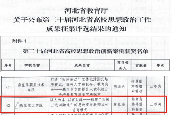 本网讯(马克思主义学院 燕伟璇)日前,河北省教育厅公布了第二十届河北省高校思想政治工作成果征集评选结果,我校马克思主义学院教师黄春梅主持,韩高良、燕伟璇和韩静丽主要参与申报的《以人为本以育为魂——构建“三探三进四融通”的思政青年教师成长培育模式》项目荣获省高校思想政治创新案例三等…