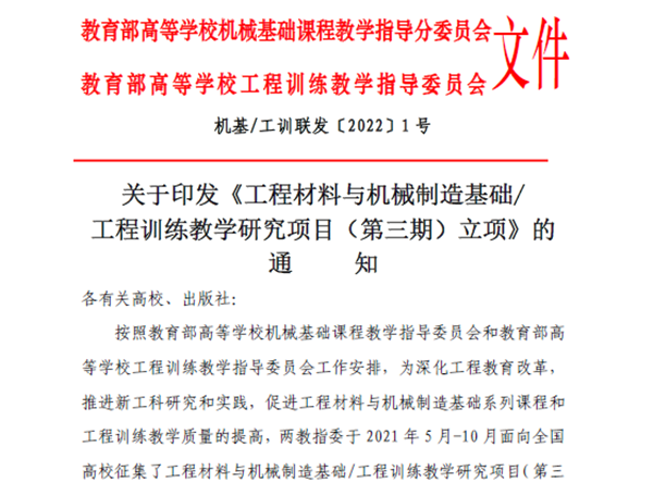 本网讯(发展规划处 艺术学院 刘鹏飞)近日,教育部高等学校机械基础课程教学指导委员会和教育部高等学校工程训练教学指导委员会下发了《关于印发《工程材料与机械制造基础/ 工程训练教学研究项目(第三期)立项》的通知》(机基/工训联发〔2022〕1号),燕京理工学院由艺术学院沈…