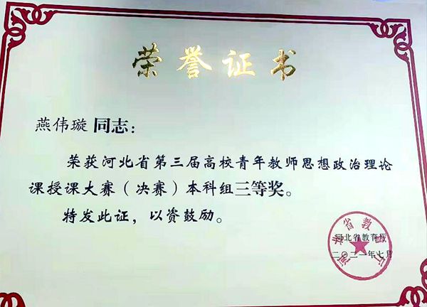 本网讯(思政教研部 燕伟璇 丁娟)近日,河北省教育厅组织开展的河北省第三届高校青年教师思想政治理论课授课大赛决赛结果揭晓,我校思政教研部青年教师燕伟璇荣获河北省第三届高校青年教师思想政治理论课授课大赛(决赛)本科组三等奖。 今年6月,河北省举办第三届高校青年教师思想政治理论课授课…