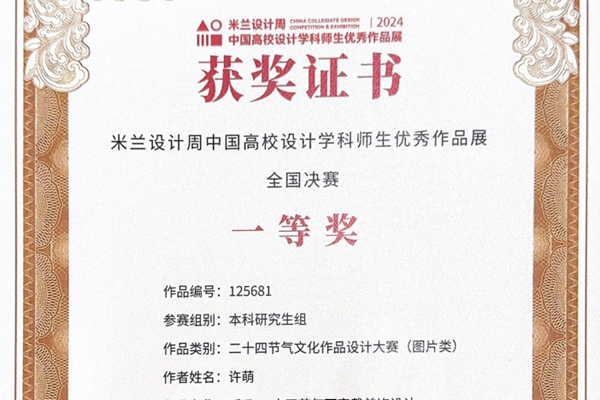 本网讯(艺术学院 曾令晋)10月8日,米兰设计周中国高校设计学科师生优秀作品展(后文简称米兰设计周作品展)落下帷幕,艺术学院学生参赛作品经过学校专业教师的指导与选送,在众多高校学子中脱颖而出,最终获国家级一等奖1项,三等奖5项,石慧娜老师获优秀指导教师荣誉。 部分获奖证书 米兰设…