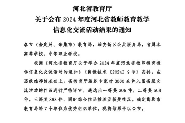 本网讯(艺术学院 李思颖)近日,河北省教育厅公布2024年度河北省教师教育教学信息化交流活动评选结,艺术学院周艺、严思寒、刘紫薇三位老师荣获得省级教师赛一等奖。 公示文件 河北省教育厅组织专家对3000余件入围省级交流活动的作品进行严格评审。燕京理工学院环境设计专业,本…
