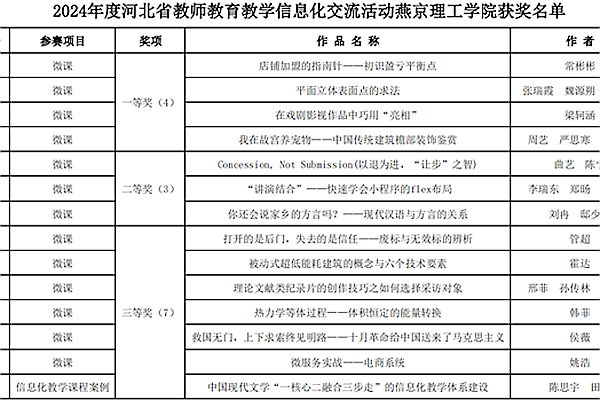本网讯(教务处 李慧)近日,河北省教育厅发布了《关于公布2024年度河北省教师教育教学信息化交流活动结果的通知》(冀教技术〔2024〕26号),学校在高等教育组共有14项作品获奖,其中一等奖4项,二等奖3项,三等奖7项。同时,学校获得一等奖的4项作品被省教育厅推荐参加国赛。 获奖…