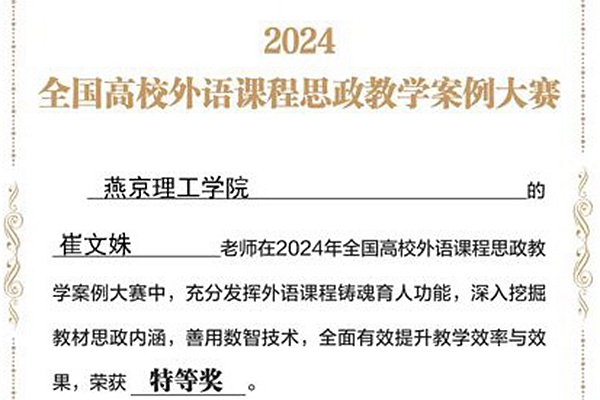 本网讯(人文教育学院 王军霞)9月10日,由外语与教学研究出版社举办的2024年全国高校外语课程思政教学案例大赛获奖名单公示,人文教育学院教师崔文姝荣获大赛特等奖、教师王军霞荣获二等奖、教师刘娜娜荣获三等奖。 获奖证书 为全面推进高校外语课程思政高质量建设,促进高校外语教师以习近…