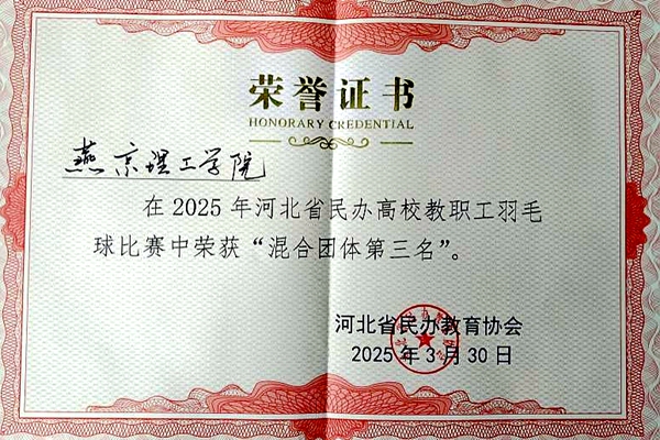本网讯(体育学院 张榜兰)3月30日,由河北省民办教育协会主办的2025年河北省民办高校教职工羽毛球比赛在石家庄成功举行。省内18所民办高校积极参与此次竞赛,旨在促进各高校教职工之间的交流与合作。经过激烈角逐,最终获得第三名。 所获荣誉 本次比赛为混合团体赛,设有男子双打、女子双…