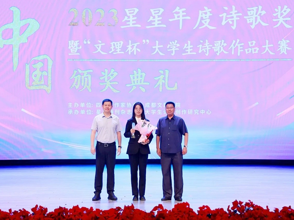 本网讯(人文教育学院 教务处 邸少华 杨杨)近日,2023·星星年度诗歌奖暨第三届“文理杯”大学生诗歌作品大赛颁奖典礼在成都文理学院星空剧场举行,我校人文教育学院汉语言文学专业2023级学生蔡佳茵凭借其新诗《爷爷的黄土》荣获特等奖。 颁奖现场 成都文理学院常务…