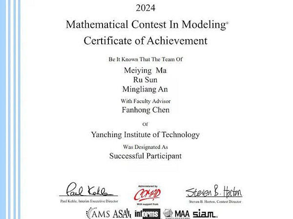 本网讯(建筑学院 陈凡红 王瑶瑶)近日,2024年美国大学生数学建模竞赛获奖结果公布,建筑学院学子造价专业孙茹、会计专业马美莹、计科专业安明亮组,计科专业高焕栋、计科专业石龙辉、软件专业刘真组,计科专业杨文可儿、计科专业张鑫、软件专业崔子夜组共9名同学表现优异,三组参赛组获得S奖…