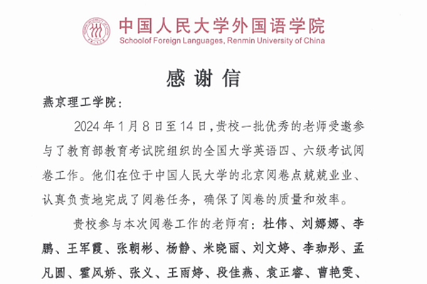 本网讯(教务处 杜伟)1月8日至14日,应中国人民大学外国语学院(全国大学英语四、六级考试北京阅卷点)邀请,经学校批准,刘娜娜、杜伟、李鹏、张义、王军霞、韩猛、张朝彬等40余位英语骨干教师代表学校参加了为期7天的全国大学英语四六级阅卷工作。其中,杜伟、李鹏、刘娜娜分别担任六级写作…