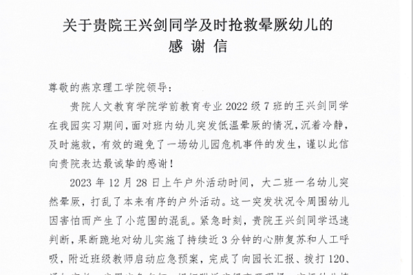 本网讯(人文教育学院 王妍)1月9日,人文教育学院学前教育专业王兴剑同学收到来自实习单位三河市港中旅幼儿园的感谢信。王兴剑同学在该园实习期间,面对班内幼儿突发低温晕厥的情况,沉着冷静,及时施救,有效地避免了一场幼儿园危机事件的发生。 感谢信全文 王兴剑同学于2023年9月前往三河…