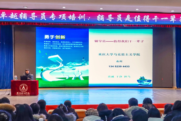 本网讯(学生处 任佳慧)12月22日,我校在报告厅开展卓越辅导员专职培训,提升辅导员的思想政治素质和业务水平。邀请了重庆大学马克思主义学院党委副书记、全国首届“高校最美辅导员"袁利进行“辅导员值得干一辈子”专题讲座,各学院党总支书记、副书记,全体辅导员老师、学生处全体老…
