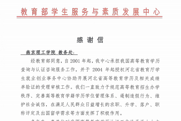 本网讯(教务处 李丽荣)近日,我校收到教育部学生服务与素质发展中心和河北省教育厅学生就业创业事务中心发来的感谢信,信中表达了燕京理工学院教务处对教育部高等教育学历认证工作给予大力支持的感谢,表扬了学校严格规范的管理制度,认真、严谨、高效的工作精神,以及为毕业生排忧解难的服务意识。…