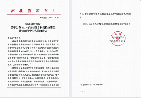 本网讯(教务处 信息科学与技术学院 李颖 蔡小庆)近日,河北省教育厅发布《关于公布2023年度普通本科高校应用型转型示范专业名单的通知》(冀教高函〔2023〕78号),将53个本科专业确定为2023年度河北省应用型转型示范专业,其中公办高校50个,民办高校3个,我校物联网工程专业…