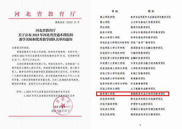 本网讯(智能工程学院 钟宇菲)近日,河北省教育厅下发《关于公布2023年河北省普通本科院校教学名师和优秀教学团队名单的通知》(冀教高函〔2023〕51号),燕京理工学院智能工程学院以李秋生教授为带头人的“智能制造专业方向课程团队”获评河北省优秀教学团队。 获奖通知 团队带头人为智…