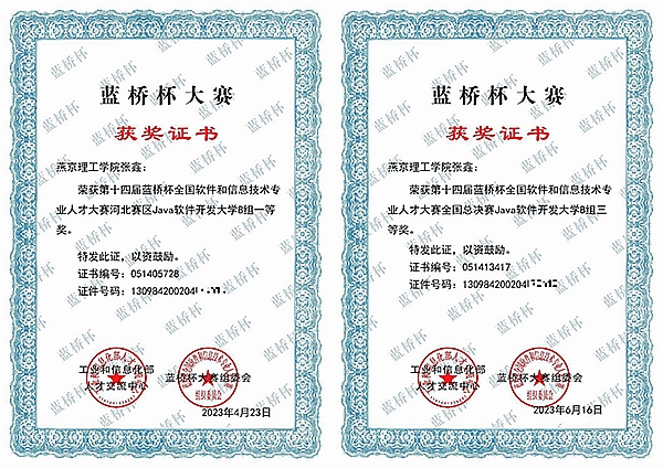本网讯(信息科学与技术学院 冯菲)近日,第十四届蓝桥杯全国软件和信息技术专业人才大赛中成功举办,燕京理工学院信息科学与技术学院计算机科学与技术系2105班张鑫同学在本次比赛中荣获国家级三等奖和省级一等奖的佳绩。 张鑫同学的获奖证书 赵暄老师获优秀指导教师的获奖证书 据悉,蓝桥杯是…