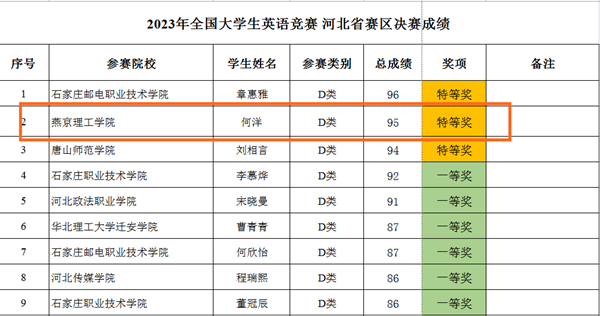 本网讯(文法学院 杨婧)近日,在2023年全国大学生英语竞赛初赛和决赛中,燕京理工学院何洋同学荣获D类特等奖;张静怡、赵栋璇同学获得B类一等奖;金雨蒙、李悦、王嘉钰等七名同学获得C类一等奖;张津源、屈小婷同学获得D类一等奖。 获奖名单(部分) 据悉,全国大学…