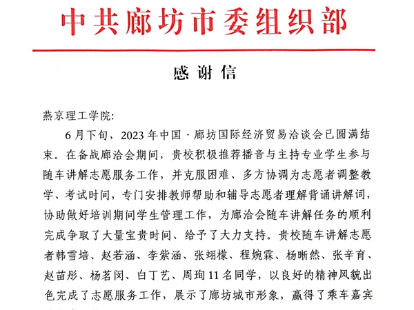 本网讯(传媒学院 李莹)“2023年廊洽会随车讲解志愿工作的圆满完成,离不开志愿者的辛勤付出,也离不开贵校的倾力配合,在此向贵校及志愿者表示由衷感谢!”7月1日,燕京理工学院传媒学院收到了一封来自中共廊坊市委组织部的感谢信,信中对传媒学院2022级播音与主持艺术专业学生韩雪培、赵…