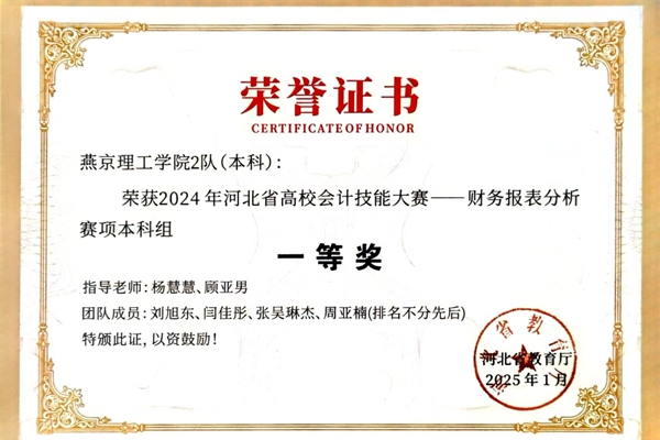 本网讯(会计学院 苏奕萌)近日,由河北省教育厅主办,河北经贸大学承办,厦门科云信息科技有限公司以及新产教河北信息科技有限公司提供技术支持的2024年河北省高校会计技能大赛财务报表分析赛落下帷幕,会计学院学子喜获本科组一等奖。 获奖证书 本次会计技能大赛采用科云财务大数据分析云平台…