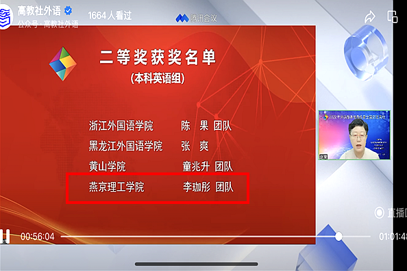 本网讯(文法学院 李珈彤)11月5日,由高等教育出版社、全国高校教师网络培训中心与《中国外语》编辑部共同组织的“2022年外语微课优秀作品全国交流活动”成功举办,持续8个月的“2022年外语微课优秀作品征集与交流活动”圆满落幕。文法学院李珈彤团队(团队成员:李雅婷、李春…