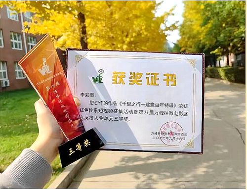 本网讯(传媒学院 毕璟璇)我校传媒学院播音2104班李彩青创作的《千里之行——建党百年特辑之红色传承》在“第八届万峰林国际微电影盛典”中获得英模类人物单元三等奖佳绩。该作品是以红色为主题的短视频,由李彩青同学本人出镜并朗诵。 万峰林国际微电影盛典是由中国社会科学院新闻与传播研究所…