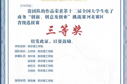 本网讯(学生处 高亚丹)近日,第十二届全国大学生电子商务“创新、创意及创业”挑战赛(以下简称三创赛)河北赛区省级选拔赛结果揭晓,我校学生作品《37℃心理健康交流平台——以青春之我成就青春之你》荣获省级三等奖。 获奖证书 本届赛事采用通讯评审、网络路演答辩的形式进行选拔,共吸引了4…