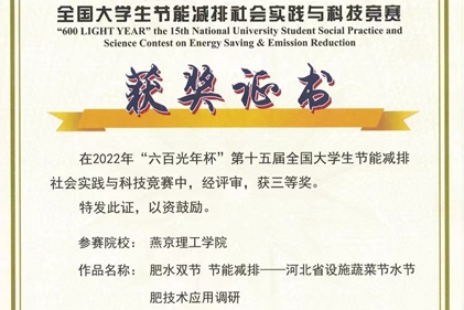 本网讯(学生处 高亚丹)近日获悉,由王伟冉、王艳霞指导,王举昂、王欣雨、曹佳悦参加的社会实践调查类作品《肥水双节节能减排——河北省设施蔬菜节水节肥技术应用研究》项目在2022年“六百光年杯”第十五届全国大学生节能减排社会实践与科技竞赛中荣获三等奖;李延辉、曹安浩、曹元成参加的《河…