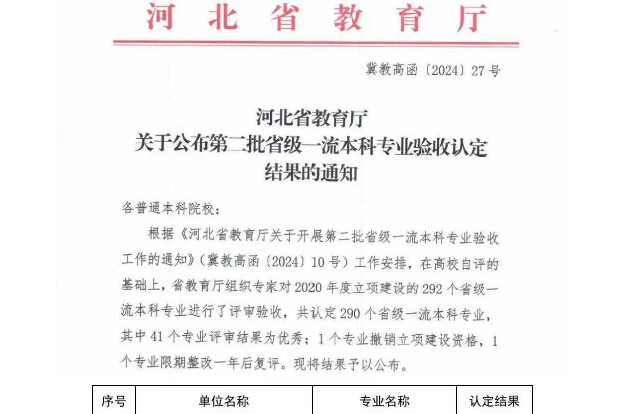 本网讯(教务处 李慧)近日,根据《河北省教育厅关于公布第二批省级一流本科专业验收认定结果的通知》(冀教高函【2024】27号),我校视觉传达设计、审计学和自动化3个专业顺利通过验收,被正式认定为河北省一流本科专业,这是我校在提升教育教学质量,推动学科建设和人才培养方面取得的重要成…