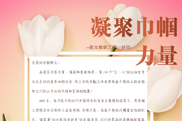 本网讯(宣传部 刘婷婷 贺雨欣 李俊铭 王浩杰 万嘉旭 薛竣泽)3月8日,在第114个“三八”国际妇女节之际,燕京理工学院在节日期间推出内容丰富、形式多样的活动,为广大女性师生送上节日祝福。 致全校女教职工的一封信 “第114个‘三八’国际妇女节在这个美好的春季如期而至…