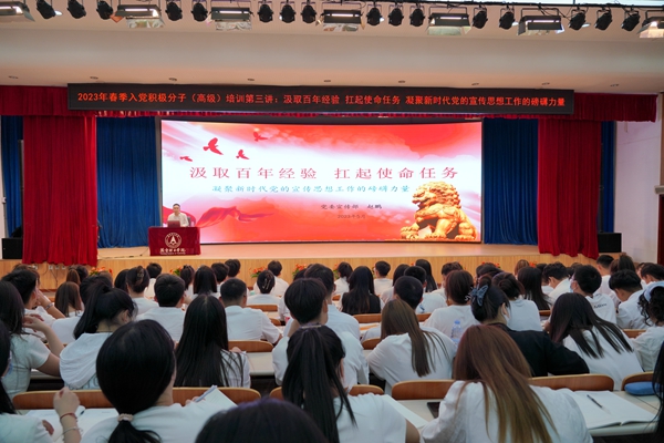本网讯(党委办公室 王彦硕 侯芊羽)2023年5月23日,燕京理工学院2023年春季入党积极分子(高级)培训班第三讲在学校报告厅如期举行,此次培训的主题为《汲取百年经验,扛起使命任务,凝聚新时代党的宣传思想工作的磅礴力量》,本次培训由党委宣传部部长、校长助理、副教授赵鹏主讲。 培…