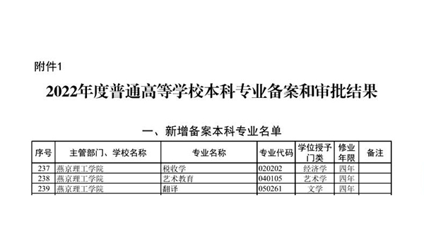 本网讯(教务处 李丽荣)近日,教育部公布了2022年度普通高等学校本科专业备案和审批结果。燕京理工学院2022年度申请增设的税收学、艺术教育、翻译3个本科专业获批准,这意味着燕京理工学院2023年将新增3个本科专业。 备案和审批结果(非源文件) 学校坚持以地方经济社会发展需求为导…