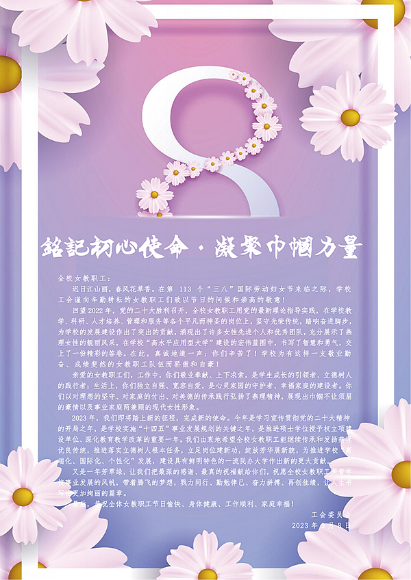 本网讯(宣传部 李家曾 刘婷婷)“在第113个‘三八’国际劳动妇女节来临之际,学校工会谨向辛勤耕耘的女教职工们致以节日的问候和崇高的敬意!”3月8日一早,燕京理工学院工会委员会通过校园媒体平台和各个工作群发布了致全校女教职工的一封信。当日,学校工会还组织开展…