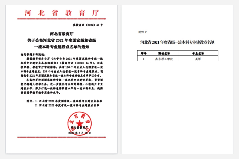 本网讯(宣传部 文法学院 徐鑫 祝婧琦)根据《河北省教育厅关于公布河北省2021年度国家级和省级一流本科专业建设点名单的通知》(冀高教函〔2022〕41号)文件,燕京理工学院英语专业正式获批成为省级一流专业。至此,与2019和2021年获批的法学、会计学、物联网工程、物流管理、制…