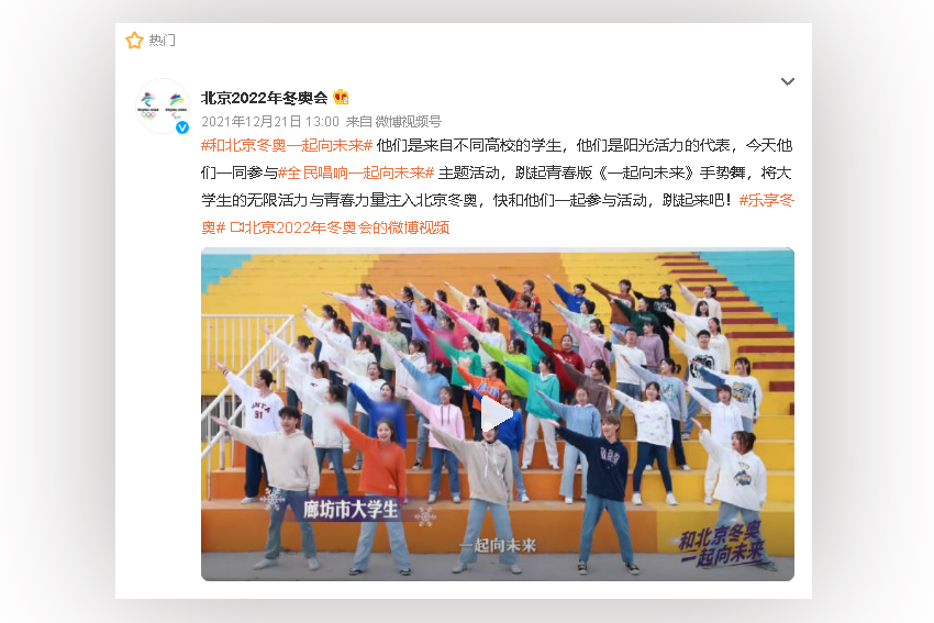 燕京理工学院师生《一起向未来》手势舞被@北京2022年冬奥会 官方微博采用 本网讯(记者 赵树金 体育、文法、艺术学院供图)“我们都拥有爱,来把所有门全都敞开,Together for a shared future,一起来,Together,一起向未来!”2…