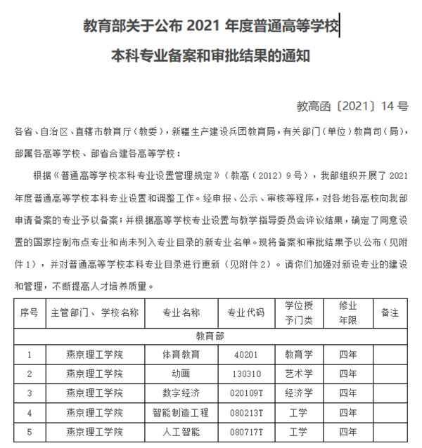 本网讯(教务处 李丽荣)近日,教育部发布了《教育部关于公布2021年度普通高等学校本科专业备案和审批结果的通知》(教高函〔2021〕14号),燕京理工学院申报增设的体育教育、动画、数字经济、智能制造工程、人工智能5个本科专业成功获批。 2021年度普通高等学校本科专业备案和审批结…