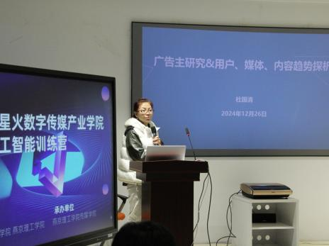 2024年12月26日星期四,杜国清教授《广告主研究&用户、媒体、内容趋势深析》与殷凡东老师研究讲座于燕京理工学院传媒学院f401圆满举行。作为中国广告学领域首位博士,杜国清教授在专业领域深耕多年,为我国广告学理论与实践发展作出了卓越贡献。讲座聚焦广告主研究前沿领域,杜国清教授不仅深入剖析了当下广告主市场战略的多元格局与动态演变,更着眼于当下数字化浪潮的前沿趋势,着重阐述了广告主如何“拥抱AIGC”以提升创意设计与内容生产效率。从传统广告主的市场布局到数字化时代广告主的创新转型,教授运用详细的数据与经典案例,精准解读了广告主营销理念从产品中心向消费者中心的关键转变节点,为师生们呈现了一幅全面且细致的广告主研究学术画卷。