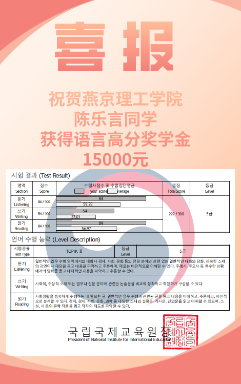 传媒学院2020级学生陈乐言取得韩语TOPIK5成绩,并已通过本(专)硕直通成功入读韩国东国大学。根据燕京理工学院本(专)硕直通定向培养语言高分奖学金标准,给予语言奖学金15000元。