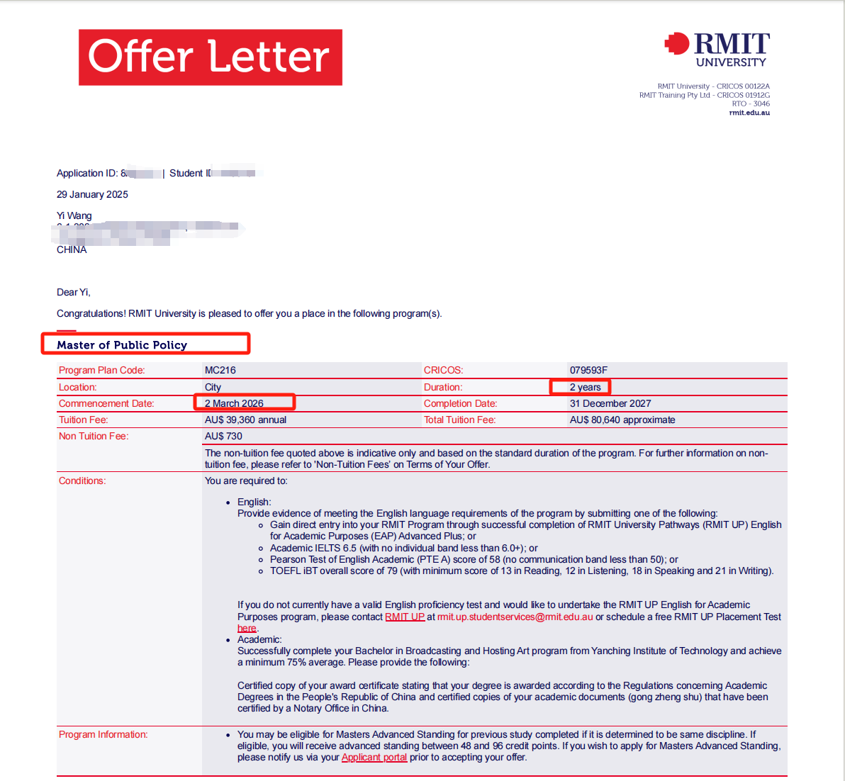 喜报!传媒学子王一同学喜获QS世界排名123位名校皇家墨尔本理工大学offer