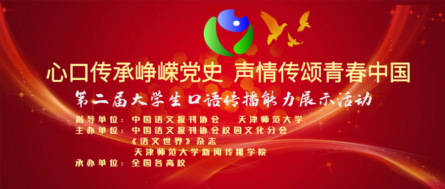 由中国语文报刊协会校园文化分会、《语文世界》杂志、天津师范大学新闻传播学院共同主办、全国各高校联合承办、并在天津师范大学和中国语文报刊协会指导下的第二届大学生口语传播能力展示活动圆满落幕。本次活动结合国家疫情防控要求,采取线上直播方式进行,活动的主题是:心口传承峥嵘党史,深情传颂青春中国。