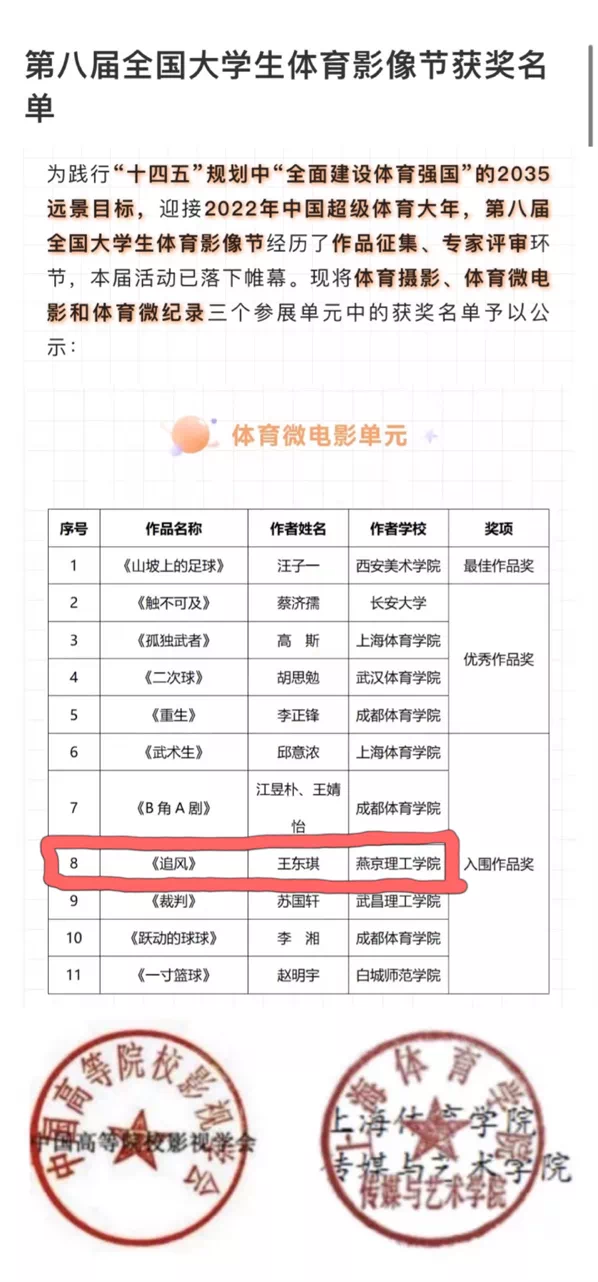 喜报 | 传媒学院体育题材作品《追风》喜获第八届全国大学生体育影像节三等奖!