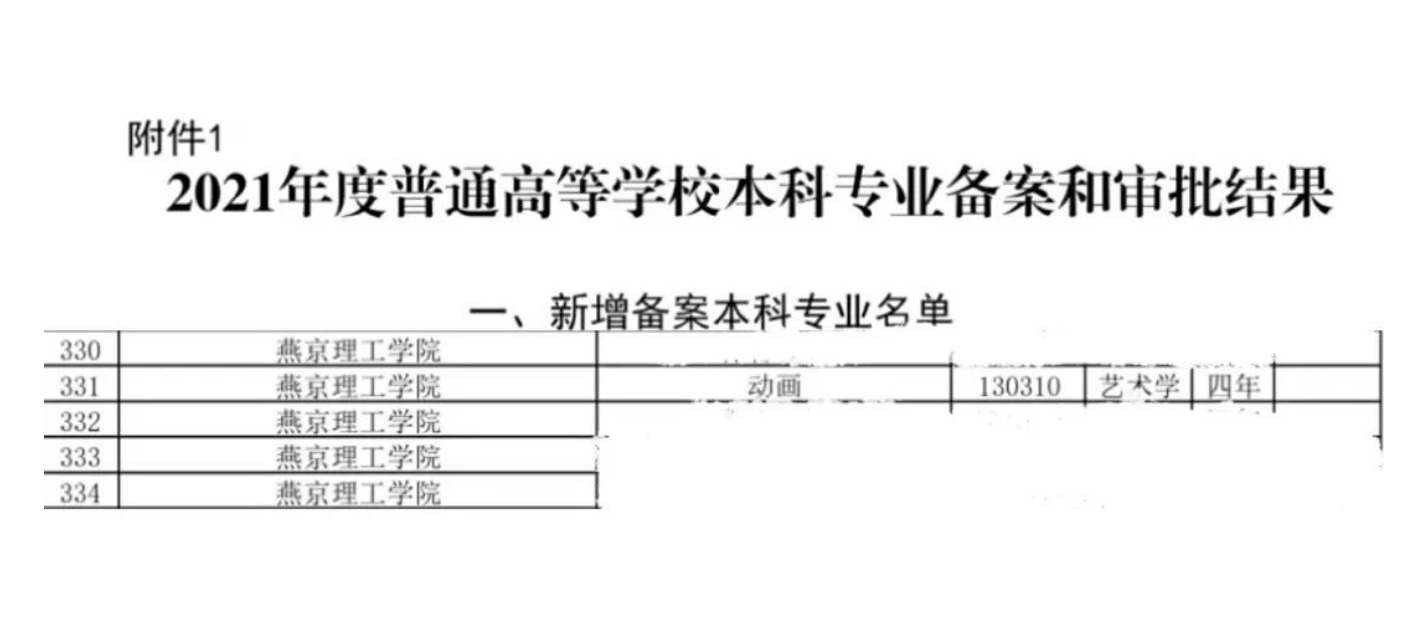 2月22日,教育部下发了《教育部关于公布2021年度普通高等学校本科专业备案和审批结果的通知》,完成了2021年度普通高等学校本科专业设置和调整工作。经申报、公示、审核等程序,对包括燕京理工学院传媒学院动画专业在内的各地各高校申请备案的专业予以通过。