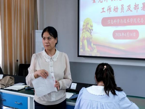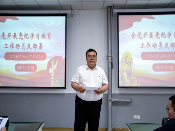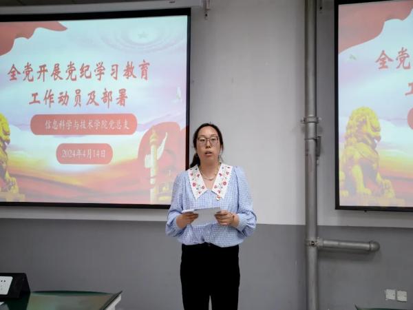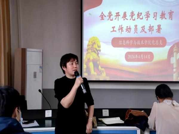 本网讯(信息科学与技术学院)4月14日下午,信息科学与技术学院党总支在A310组织召开党纪学习教育安排部署会,传达学习习近平总书记关于加强党的纪律教育的重要论述,认真贯彻落实党的建设领导小组会议精神,研究部署院党纪学习教育工作。信息科学与技术学院党总支书记朱雷主持会议并讲话,信息科学与技术学院院长李丽芬,副院长云彩霞,党总支副书记刘伟以及全体教职工参加会议。