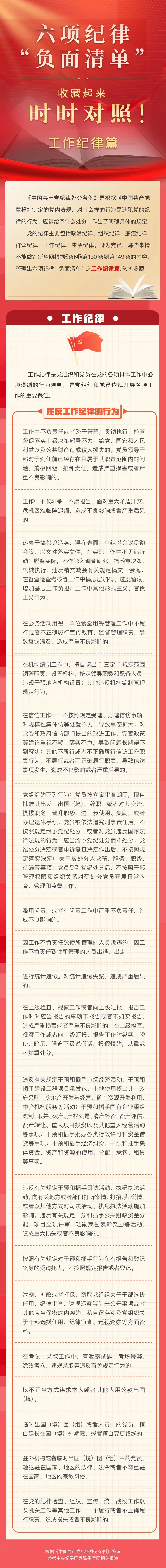 本网讯(来源:新华网)当前,全党正在开展党纪学习教育。这次党纪学习教育明确要聚焦解决一些党员、干部对党规党纪不上心、不了解、不掌握等问题,组织党员特别是党员领导干部认真学习《中国共产党纪律处分条例》,做到学纪、知纪、明纪、守纪,搞清楚党的纪律规矩是什么,弄明白能干什么、不能干什么,把遵规守纪刻印在心,内化为言行准则,进一步强化纪律意识、加强自我约束、提高免疫能力,增强政治定力、纪律定力、道德定力、抵腐定力,始终做到忠诚干净担当。我们根据《条例》内容,整理出六项纪律“负面清单”。今天推出“负面清单”之工作纪律篇,一起收藏学习。