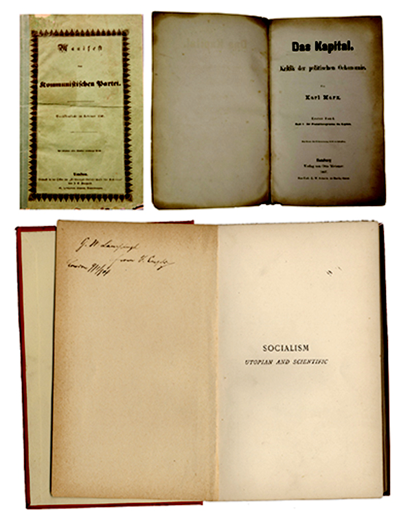 左上图为1848年《共产党宣言》德文第一版。右上图为1867年《资本论》德文第1卷第一版。下图为恩格斯的题字赠书《社会主义从空想到科学的发展》,1892年英文版。 中央党史和文献研究院供图