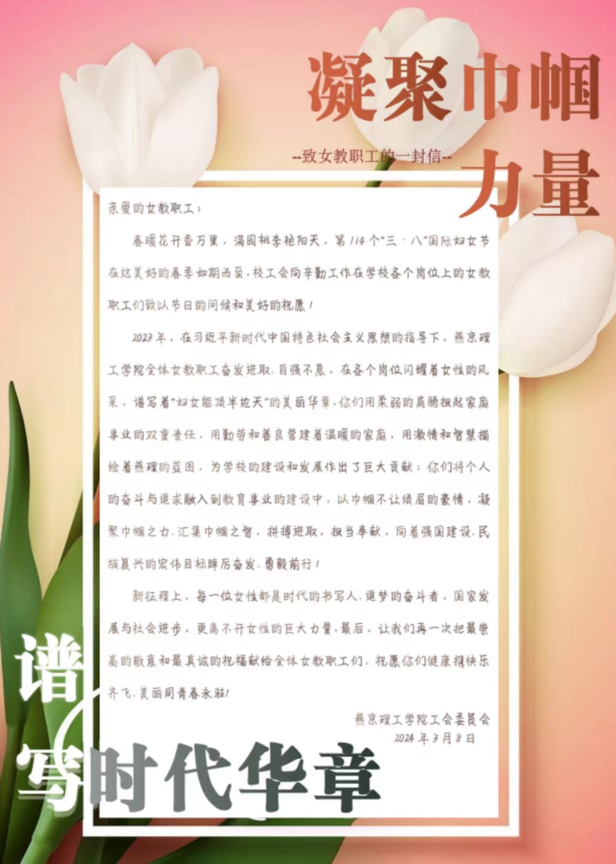 2023年,在习近平新时代中国特色社会主义思想的指导下,燕京理工学院全体女教职工奋发进取、自强不息,在各个岗位闪耀着女性的风采,谱写着“妇女能顶半边天”的美丽华章。你们用柔弱的肩膀担起家庭事业的双重任,用勤劳和善良营建着温暖的家庭,用激情和智慧描绘着燕理的蓝图,为学校的建设和发展作出了巨大贡献;你们将个人的奋斗与追求融入到教育事业的建设中,以巾帼不让须眉的豪情,凝聚巾帼之力、汇集巾帼之智,拼搏进取,担当奉献,向着强国建设、民族复兴的宏伟目标踔厉奋发、勇毅前行!