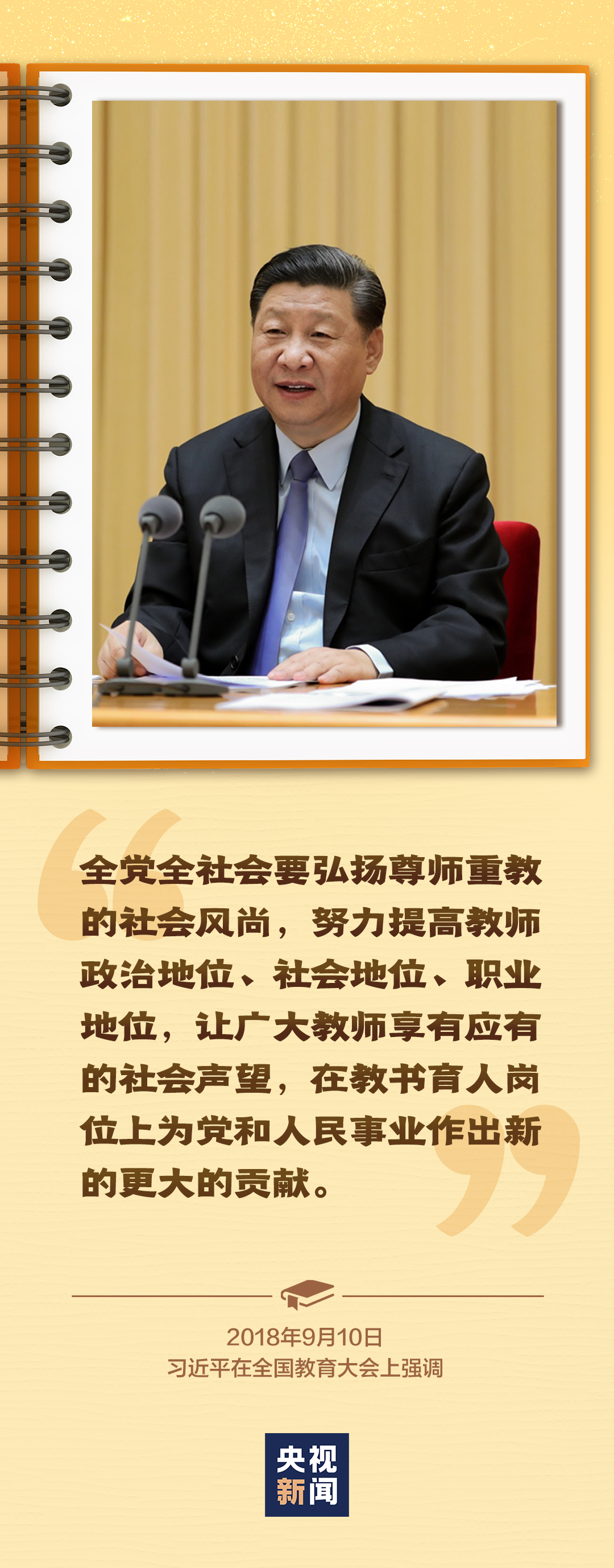 2018年9月,习近平总书记在全国教育大会上强调,全党全社会要弘扬尊师重教的社会风尚,努力提高教师政治地位、社会地位、职业地位,让广大教师享有应有的社会声望,在教书育人岗位上为党和人民事业作出新的更大的贡献。