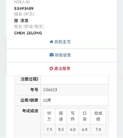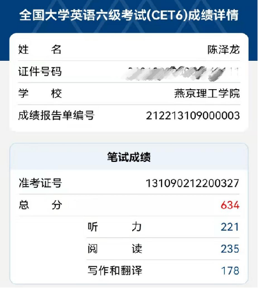 从左至右依次为陈泽龙同学英语四级、英语六级和雅思成绩