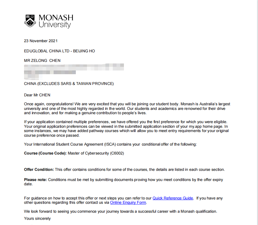 陈泽龙同学在大学入学之前就有了海外深造的想法。入学后得知学校开设了海外深造国际班,在听取了辅导员与学校老师的介绍后,了解到了项目大致情况,也清楚了海外深造能给他带来的提升以及他需要付出的努力,于是毅然报名了海外深造项目。虽然疫情让他产生了对留学生活安全问题的担忧,但是他非常清楚出国留学对他职业规划以及个人发展的意义,决定继续向前。